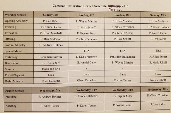 March Schedule Posted on February 28, 2018 by cameronrestorationbranch Is it spring yet? Share: Share on X (Opens in new window) X Share on Facebook (Opens in new window) Facebook Like Loading... Related